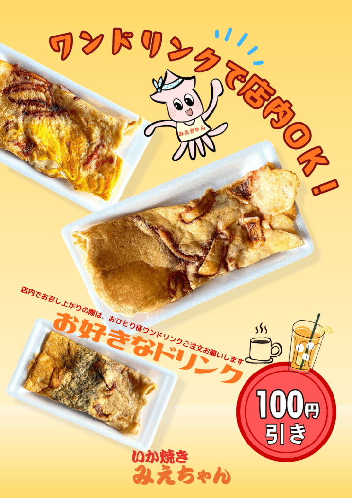 お好きな飲み物を選んで、焼き立てのいか焼きを店内で食べてみてくださいね♪